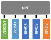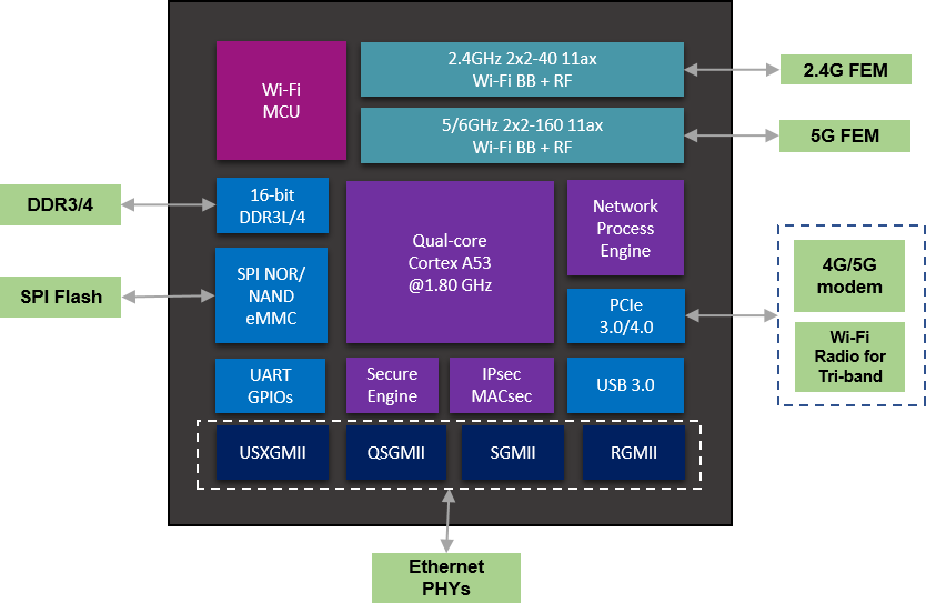 支持USXGMII/QSGMII/SGMII/RGMII 多种接口组合,芯片内部集成的高性能NPE,在bridge和NAT模式下都可以实现全端口之间的双向线速转发能力。